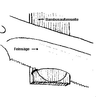 Bild 2: Anlegen des schrägen Sägeschnitts zur Überströmkante hin abfallend. Siehe auch seitliches Profil (=Bild 5/ 1) der Flöte.