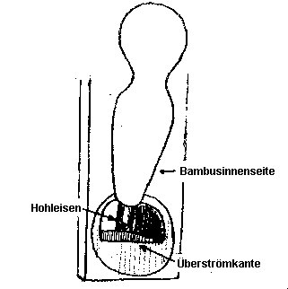 Bild 4: Hier ist die Anströmkantenseite des Flötenkopfes fertig ausgehöhlt. Es fehlt noch das LEICHTE Aushöhlen der Überströmkantenhälfte (s. Profil des Flötenkopfes Bild 5/ 1).