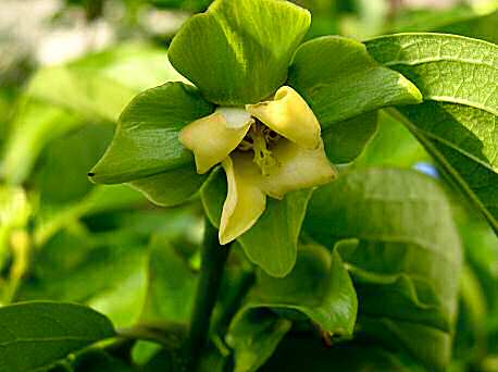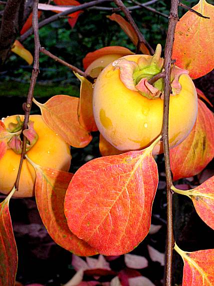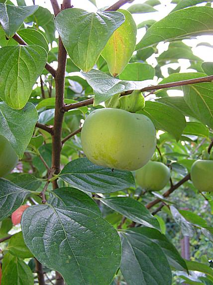 The slowly growing Kaki-tree becomes up to 15m tall, has round to elliptic, green shining leaves and has unspectacular green-yellow blooms. Its fruits have the size of tomatoes or apples; the leaves begin get luminous yellow to red colours in autumn before they fall off.